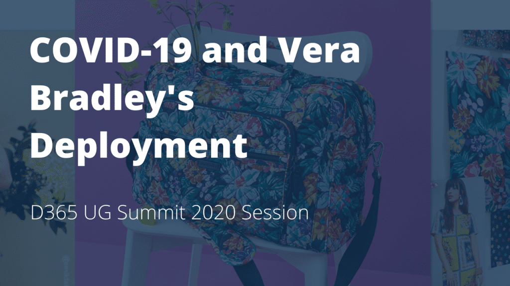 Hear from Tonya Ream, VP of Information Technology at Vera Bradley, and Adam Carrick, Project Manager at Sunrise, on how Vera Bradley replaced its ERP and entire omni-channel landscape during a global pandemic. You’ll learn how both project teams adjusted to working remotely and the key factors that ensured Vera Bradley went live on time and on budget. This presentation was recorded at Dynamics 365 UG Summit 2020. You can read more about Vera Bradley here.